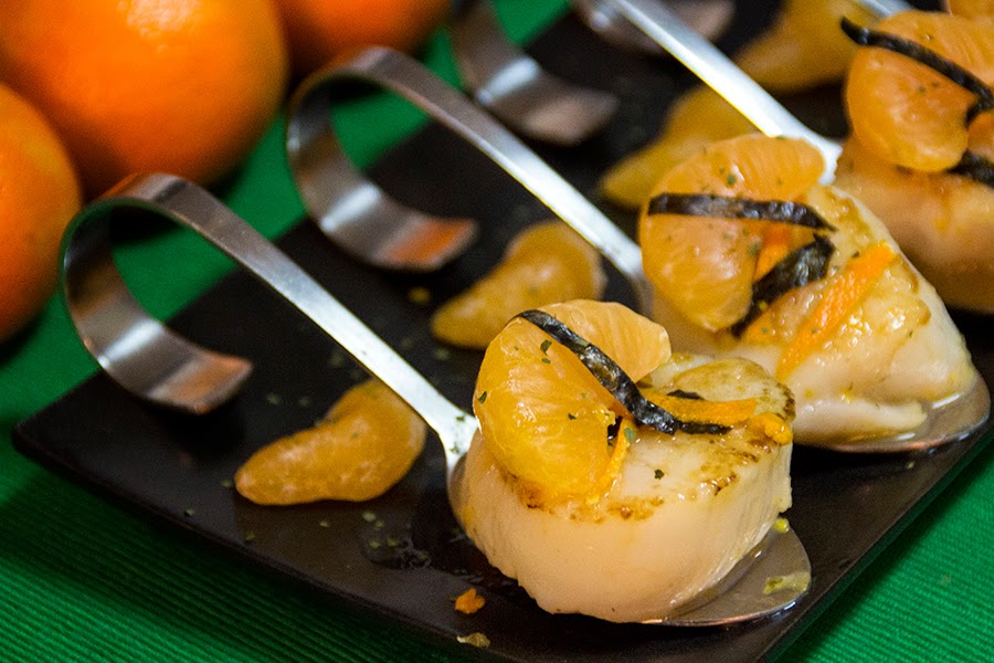 Colocamos las vieiras en cada cuchara y salseamos con la salsa de cítricos y algas. Adornamos con alguna tira de nori, un gajo de clementina y algún bastoncito de piel de mandarina. Espolvoreamos con un poco de pimienta y sal en escamas estilo Maldon.