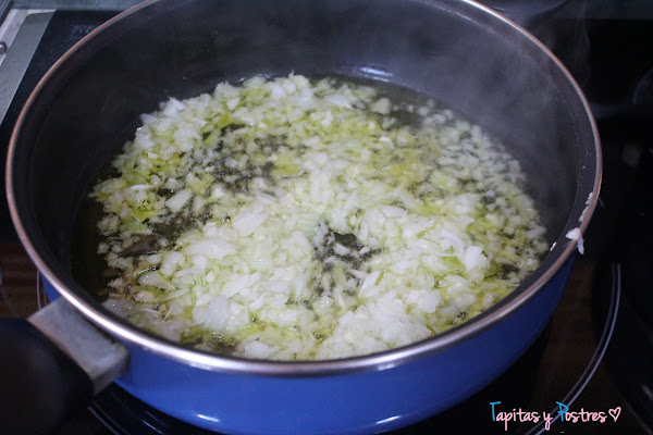 Picamos el ajo y la cebolla y lo pochamos en una cazuela con aceite.