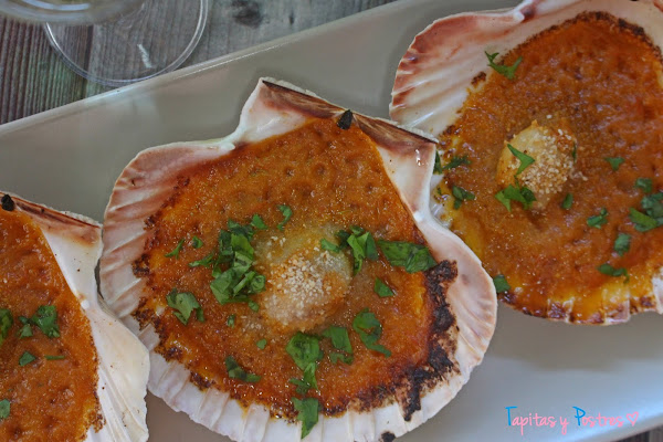 Precalentamos el horno a 180º. Colocamos cada vieira en su concha (previamente lavadas) con dos o tres cucharadas de la salsa. Espolvoreamos un poquito de pan rallado encima y las metemos en el horno para gratinar durante unos 10 minutos.