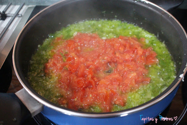 Cuando el pimiento y la cebolla estén pochados agregamos el tomate triturado, la sal y la pimienta. Cocinamos unos diez minutos.
