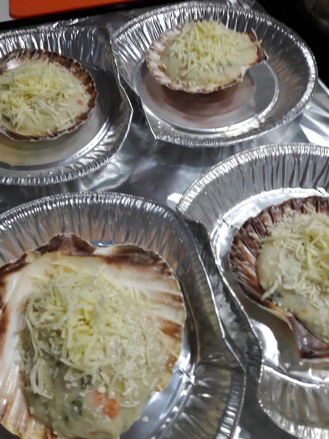 Rellenamos las vieiras, como se ve en la foto, les ponemos un montoncito de queso por encima, ya están preparadas para gratinar.