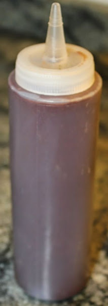 Una vez fría la salsa, se puede poner en un ¨ biberón ¨ de cocina. Los hay transparentes como en la foto o de colores como los que hay en los frankfurt para la mostaza y el ketchup.También los hay más sofisticados, pero estos son muy prácticos y duran mucho.