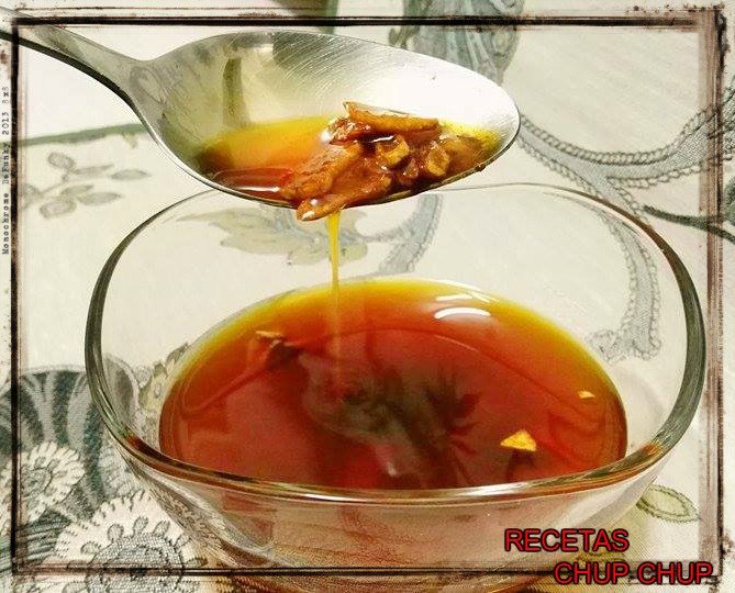 Cortamos los ajos en láminas y doramos en el aceite de oliva, cuando estén casi dorados retiramos del fuego y esperamos unos segundos a que el aceite pierda fuerza para añadir el pimentón y seguidamente el vinagre, tendremos cuidado porque puede saltar un poco, dejar enfriar y tendremos lista nuestra vinagreta.