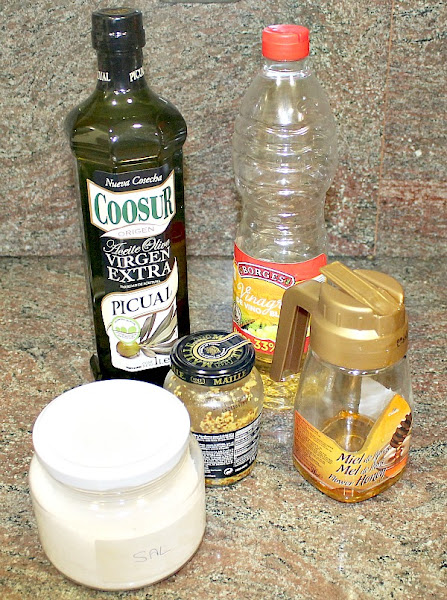 Yo os he puesto la vinagreta de mostaza y miel, pero podéis probar de hacerla de casi lo que queráis, la cuestión es ir viendo la que nos gusta más, lo único indispensable es un buen aceite y vinagre (si no no sería vinagreta, jejeje).