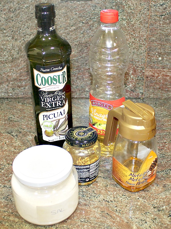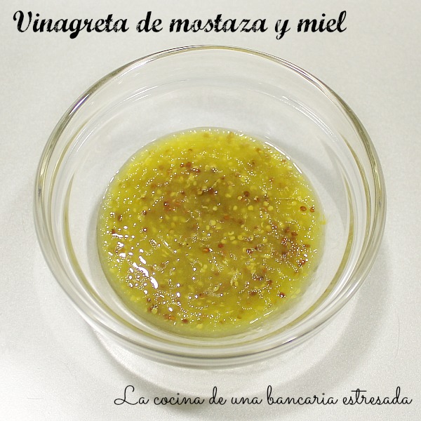 Yo os he puesto la vinagreta de mostaza y miel, pero podéis probar de hacerla de casi lo que queráis, la cuestión es ir viendo la que nos gusta más, lo único indispensable es un buen aceite y vinagre (si no no sería vinagreta, jejeje).