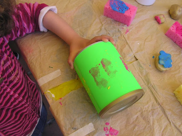 Los más pequeños pudieron disfrutar de lo lindo en un taller de pintura al aire libre organizado por uno de los artesanos de allí, donde aprendieron a decorar una lata forrada de cartulina con sellos hechos de patata mojados en pintura de distinto color. Imaginaros cómo se puso de pintura. Menos mal que se limpiaba fácilmente con agua.