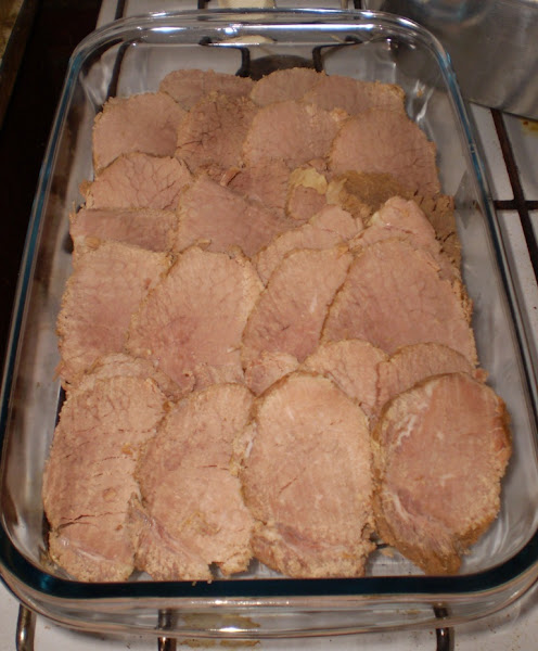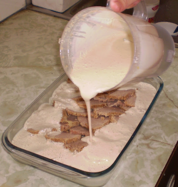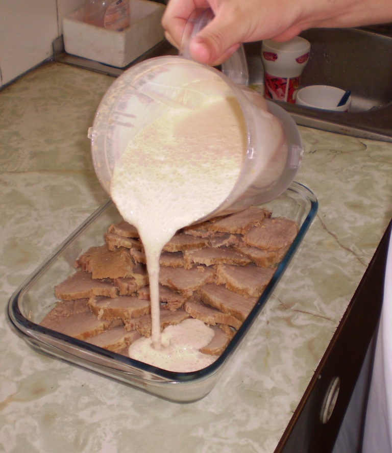 Colocamos la carne ya cortada y fría en una fuente, como un colchoncito, y echamos la salsa por encima, que cubra bien. Podemos agregar una segunda capa de carne y repetir el paso.