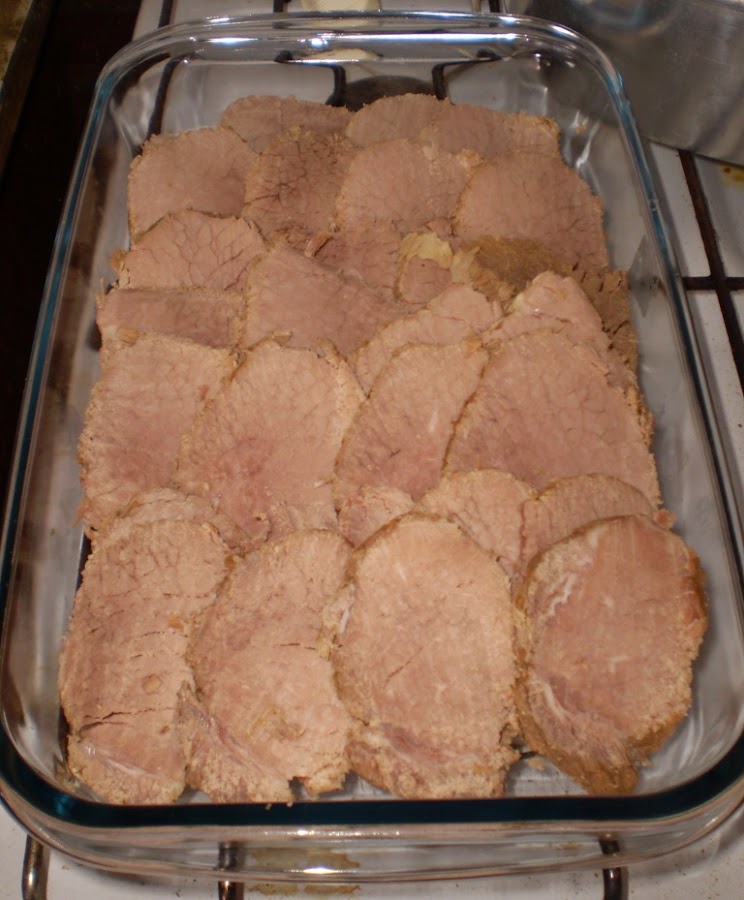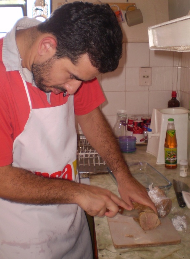 Yo lo cocino así: primero lo voy atando alrededor para que al momento de hervir no pierda su forma, aproximadamente de 2 horas, dependiendo del tamaño o en olla a presión 40 minutos, en caldo de carne con hojas de laurel, sal, etc. Lo dejo enfriar en el caldo, y una vez frío lo corto en finas rebanadas.
