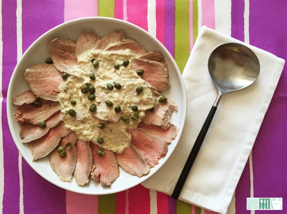 Retirar el film de la carne y cortarla en lonchas finas, colocarlas en una fuente, en una sola capa, repartir parte de la salsa por encima y el resto de alcaparras encima de la carne, poner el resto de salsa en una salsera y servir.