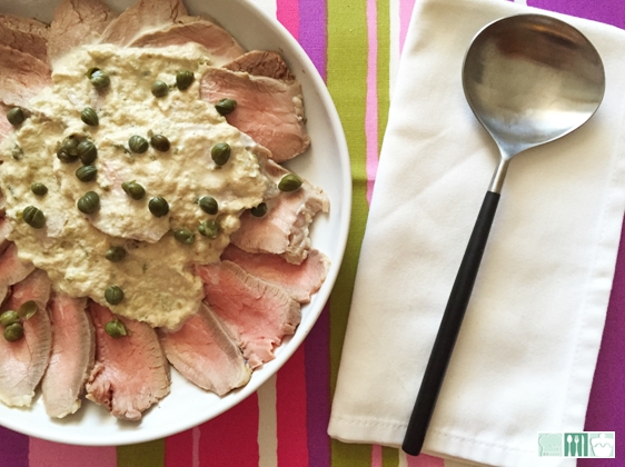 Preparar la salsa, triturando el atún con 50 grs. de alcaparra y los pepinillos, añadir la mayonesa y mezclar, salpimentar al gusto.