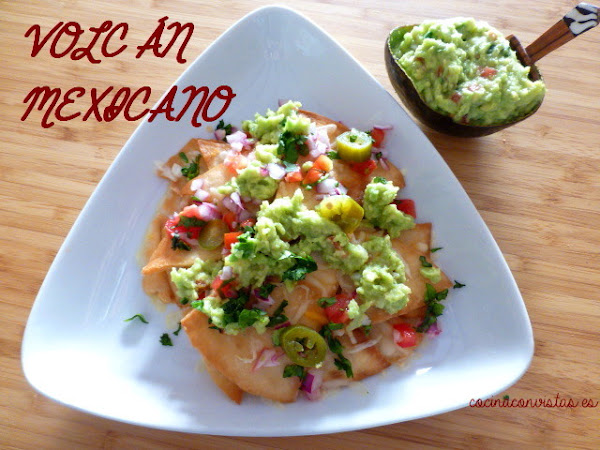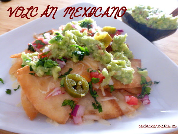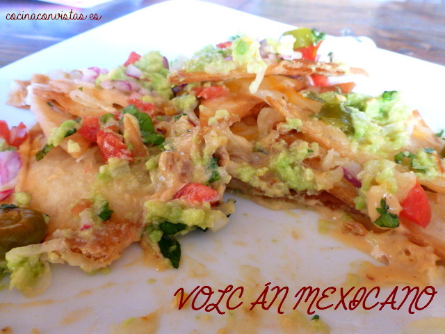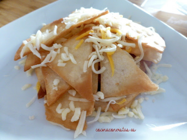 Montamos el plato: En el fondo la salsa de queso, sobre esta unos cuantos triángulos de tortilla, un poco de la mezcla de cuatro quesos, más triángulos, más mezcla de quesos y así…hasta que hagamos nuestra montañita.