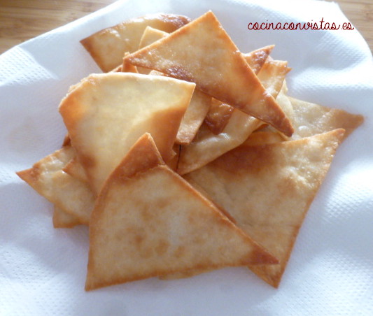 Cortamos las tortillas en triángulos y los vamos friendo por tandas en aceite bien caliente, cuando están los bordes doraditos les vamos dando la vuelta. Sacamos y dejamos escurrir sobre papel absorbente.