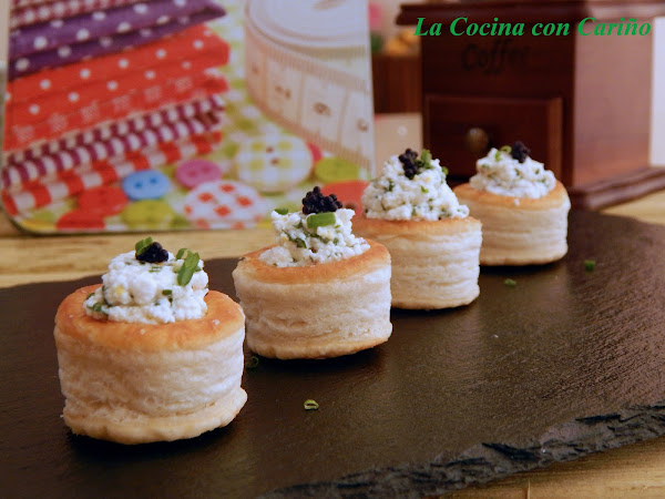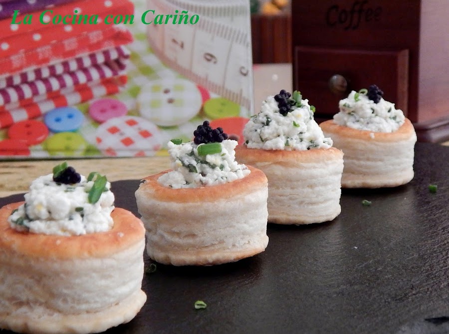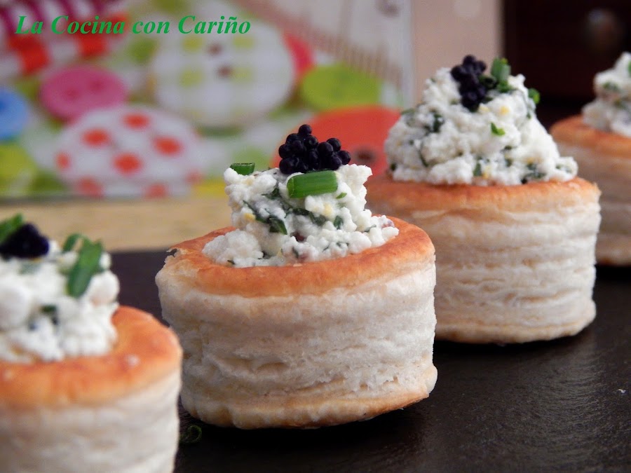 Hacemos una pasta con los ingredientes, menos con el cebollino y las huevas. Rellenamos los volovanes y rociamos por encima con un poco de cebollino. Coronamos con las huevas y listo. Si queréis podéis poner en la base, antes de rellenar con el requesón un poquito de salmorejo.