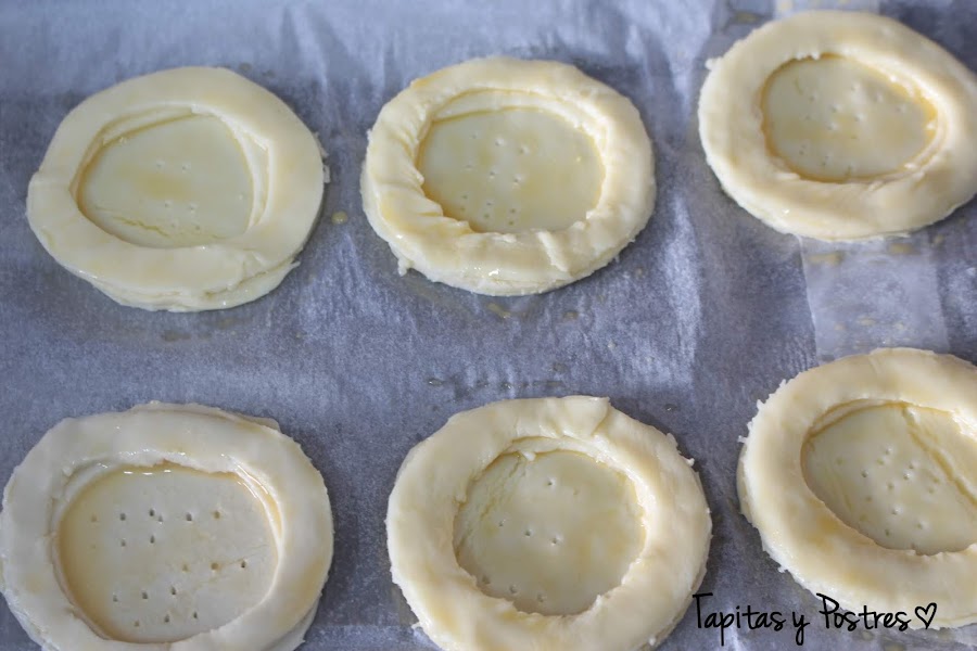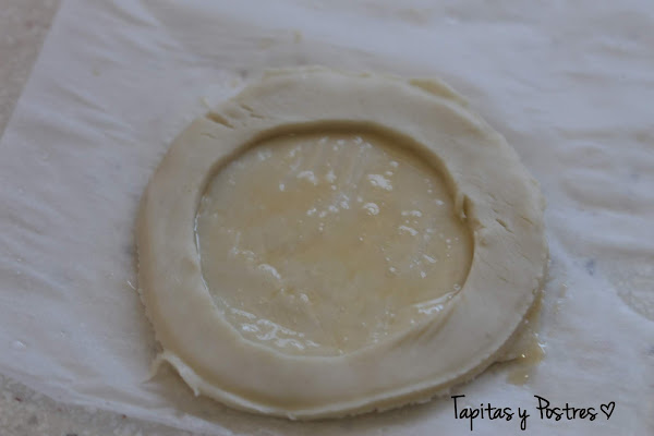 Pintamos de huevo batido el circulo completo y ponemos encima el prime aro, pintamos de nuevo de huevo y volvemos a pintar. Pinchamos el centro con un tenedor y si queremos para evitar que suba al hornear, le podemos poner unos garbanzos secos dentro.