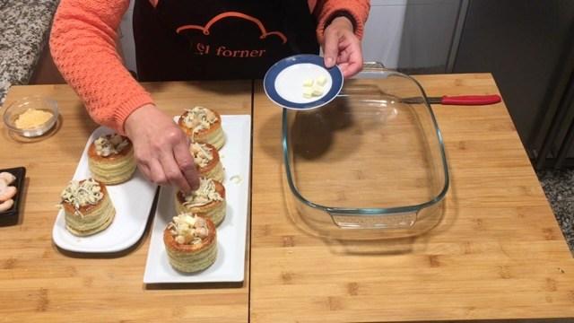 Rellenamos los volovanes y encima ponemos un poquitín de mantequilla y queso rallado.