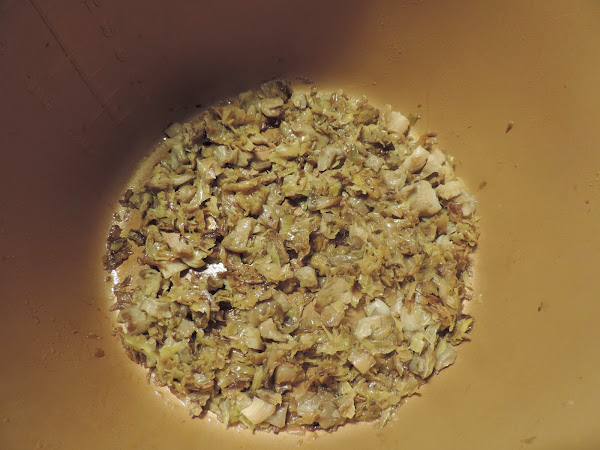 Cortamos el huvo en trozos y lo añadimos con la setas, puerro y salmón ahumado.
