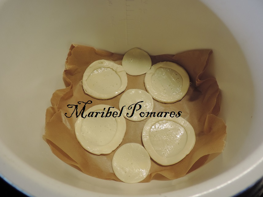Ponemos papel de horno en la cubeta de la olla y los metemos dentro, también los trozos que nos han sobrado.