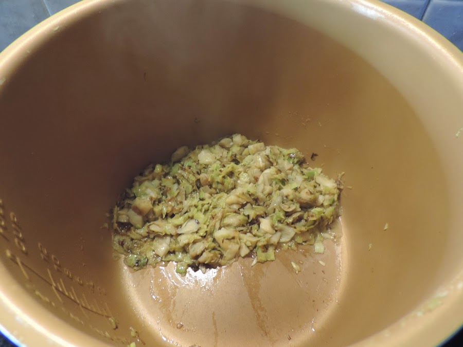 Ponemos el aceite de oliva y el puerro picado en la cubeta de la olla.