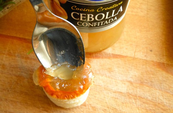 Comenzamos rellenando cada volován con una cucharadita de cebolla confitada, teniendo especial cuidado en no romperlos.