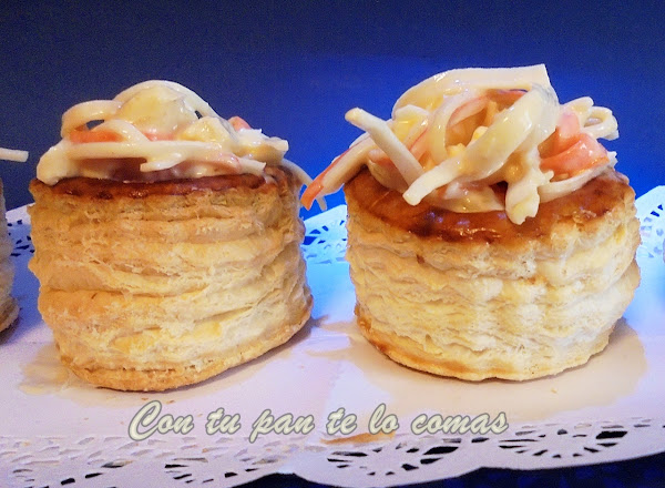 5. En el último momento, rellena los volovanes. Mejor hacerlo así para que el hojaldre no se humedezca demasiado si vas a tardar en comerlos (es lo que yo hago por si acaso).