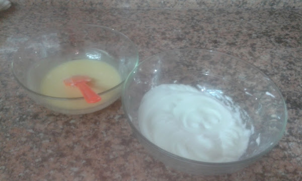 5. Montamos las claras a punto de nieve y vamos incorporando a la mezcla por partes y con movimientos envolventes.