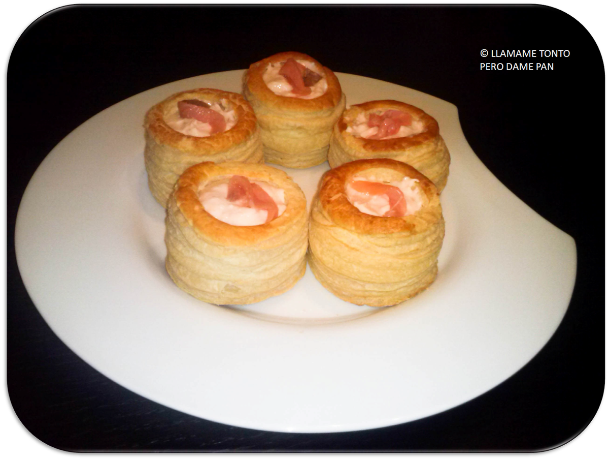 En el vaso de la picadora, si no tenéis, con la batidora, echamos el queso y el salmón (reservamos unas tiras para decorar). Batimos hasta conseguir una crema. Rellenamos los voulavent casi en el momento de servir, para que no se ablanden por la humedad de la crema.