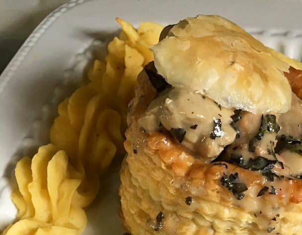 Para preparar los voulevant estirar con un rodillo un poco la pasta de hojaldre ,cortar 20 círculos a 13 círculos cortar con un cortador más pequeño para formar un aro de pasta ,coloque los círculos de pasta y barnizar con el huevo medio batido y sobre cada círculo de pasta colocar aros de pasta siempre barnizar al colocar cada aro de pasta así formar los voulevant,hornear a 350grados f por 20minutos o al ver dorar y crecer la pasta,para preparar el relleno en una sartén caliente colocamos la mantequilla y puerro picado cristalizar,condimentar el pollo con la mostaza,sal,el estragon y pimienta mezclar luego colocar en la sartén dejar cocinar,una vez listo incorpora el vino blanco dejar hervir,agregar la crema dulce cocinar 8min más a calor medio,con los voulevant listo con un cuchillo retirar la tapita de pasta para dejar espacio para colocar el relleno de pollo preparado servir de inmediato.