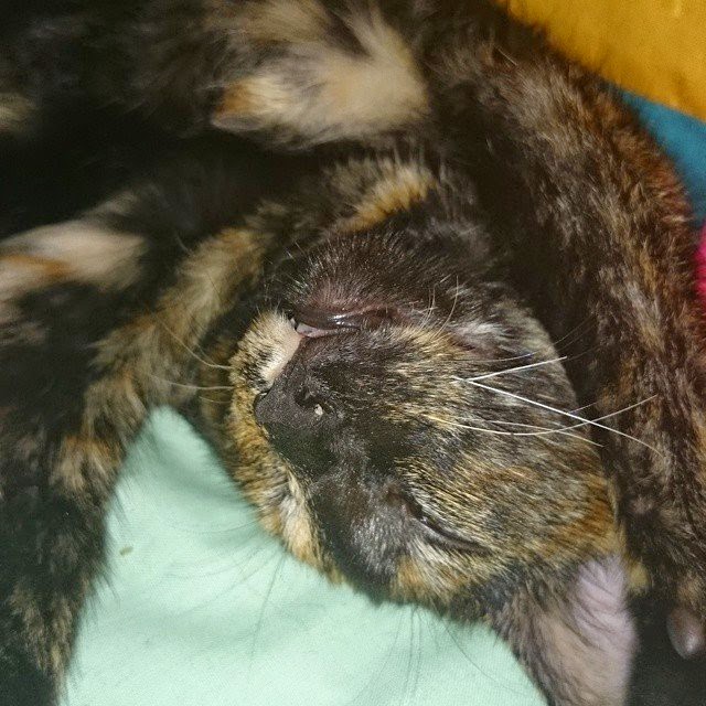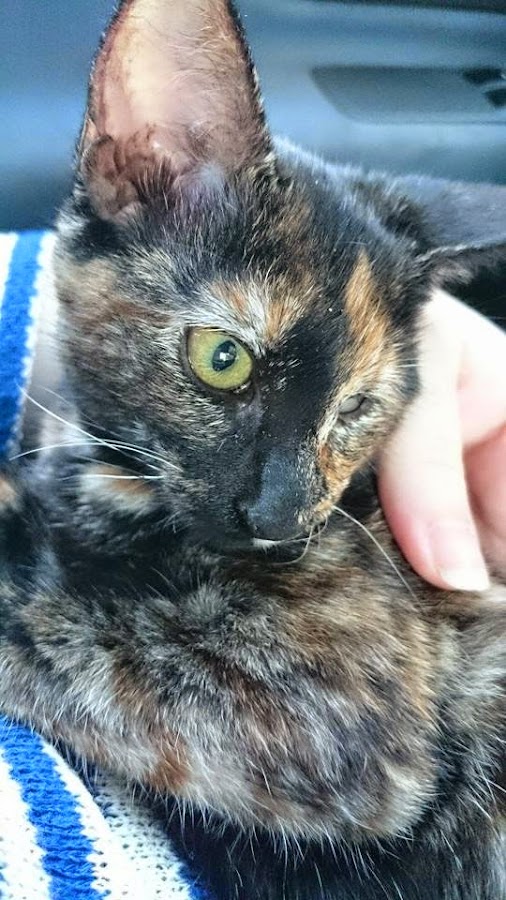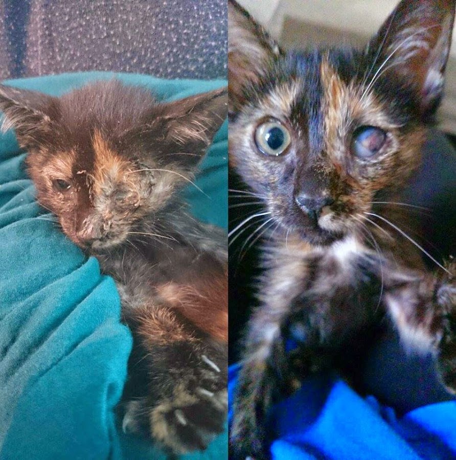La primera foto fue el día que la recogimos, con su ojito cerrado de lo mal que lo tenía. Y en la otra ya se puede ver mucho más recuperada y el ojito mejor, aunque lo que tiene es una úlcera y son muy difíciles y lentas de curar, así que aún no sabemos qué pasará.