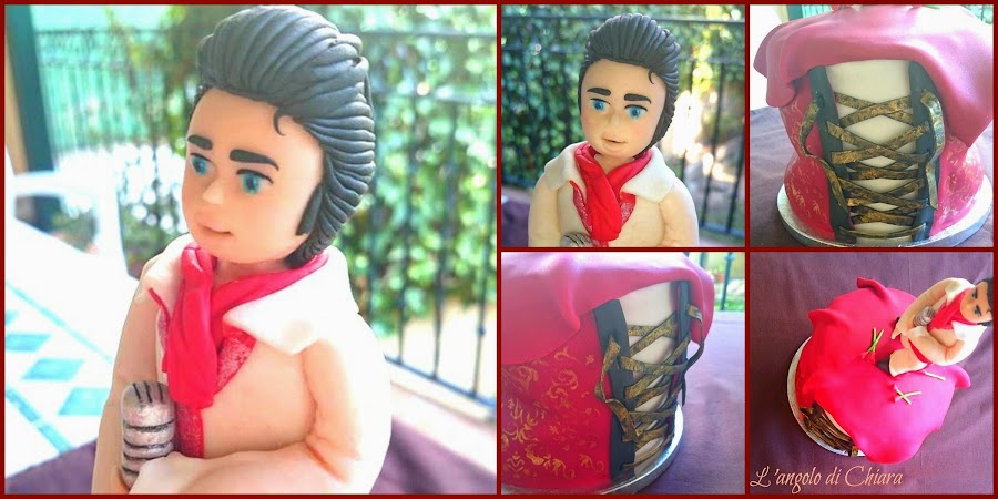 - Acabo los exámenes el día 1 de Julio (me parece... yo y mi memoria de mosquito) y justo para esa semana mi hermana me encarga una tarta para una amiga suya. Hasta ahí todo bien, es una buena noticia, una tarta para hacer, de fondant, así que yo súper feliz. Pero claro, quiere la tarta para ese mismo viernes... ¡¡¡¡¿¿¿CÓMO???!!!! Sólo tengo 3 días contados para hacer una tarta de fondant, para una despedida de soltera, en forma de corpiño y coronada con un Elvis encima.... Me empiezo a agobiar. Supongo que los que hacéis tartas de fondant y sois autodidactas como yo y no profesionales capaces de hacer un super modelado de un muñeco en una hora o menos, me entendéis. Lo único que sabía era que tenía que hacer la tarta sí o sí. Por suerte, una vez más, cuento con la ayuda de una de mis mejores amigas, a la que no le gustaba nada este mundillo hasta que empezó a echarme una mano para que pudiera acabar a tiempo las tartas. Y desde entonces se ha aficionado y me ha salvado de más de un paro cardíaco, todo hay que reconocerlo. De ella os hablaré más adelante porque va a participar mucho más a partir de ahora.