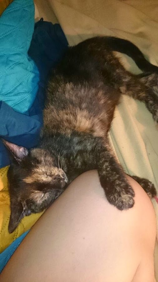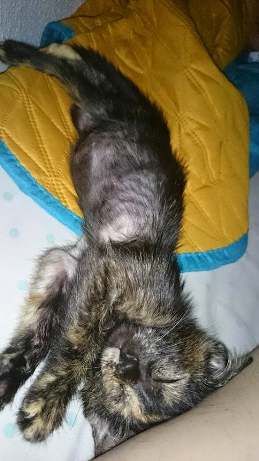 - Esta última tarta la entregué a final de Julio así que se me pasó el mes volando. Además, en esos meses (como ya conté por facebook) encontré una gatita en la calle con mi amiga, que estaba en muy malas condiciones. Apenas tenía un mes, estaba muy desnutrida y con un ojo muy malito. Y como hacía unos meses habíamos empezado a ir a un refugio de animales de voluntarias, llamamos para ver qué podíamos hacer con ella y nos dijeron que la recogiéramos para llevarla al veterinario que colabora con ellos. Y desde entonces la tenemos de acogida, mi amiga la tiene en su casa y yo voy a ayudarla cuando hay que cuidarla, llevarla al vete o comprarle cositas.