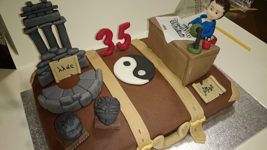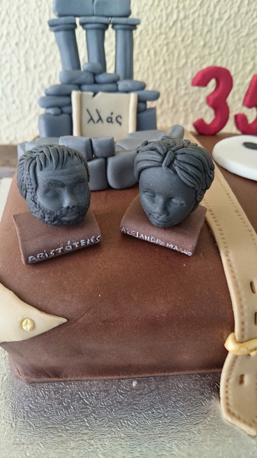 - A la semana más o menos, después de haber descansado por fin, una compañera de la universidad me escribió para ver si podía encargarme otra tarta, esta vez para su hijo. Así que por supuesto le digo que sí, la verdad es que me hizo muchísima ilusión que confiara en mí para hacer la tarta de su hijo porque además era un regalo especial, quería que fuera algo diferente, simbólico, porque cumplía 35 años y se iba a trabajar a otro país, así que era una etapa nueva de su vida importante y quería reflejarlo en la tarta. Ella me dijo todo lo que quería que saliera en ella, una etapa anterior de estudios y la nueva etapa. Así que eso fue lo que hice, tal y como me lo pidió. Le tengo que agradecer que me lo pidiera con tantos días de antelación porque así es mucho más fácil planificarse e ir haciendo cositas; por eso esta tarta la hice mucho más tranquila y de nuevo con la colaboración de mi amiga. Eso sí, la última noche de rigor despiertas no nos la quitó nadie jajaja los últimos detalles siempre buscas que queden perfectos y al final echas las horas que hagan falta. Esta tarta también la enseñé por facebook a los que me seguís, pero para quienes no la hayáis visto, este fue el resultado: