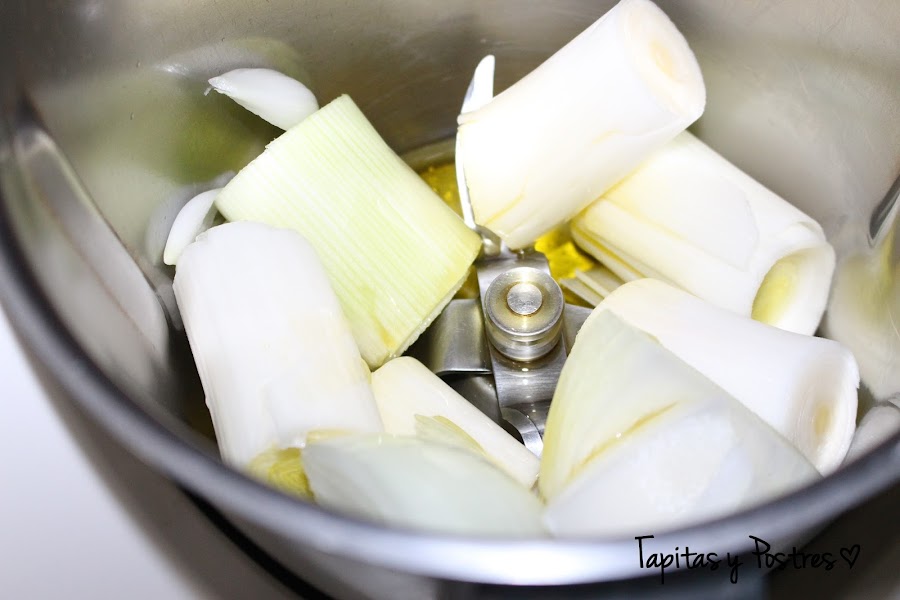Ponemos los puerros, la cebolla y el aceite en le vaso y picamos.