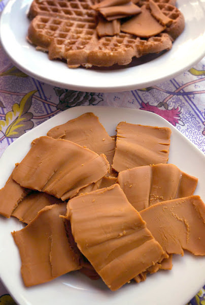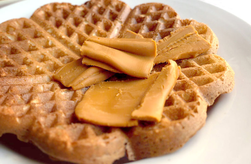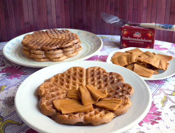 Encender y engrasar la gofrera, hacer los waffles y servirlos caliente con el queso Brunost, que previamente habremos cortado en forma de lascas con la herramienta que ellos inventaros muy acertadamente.