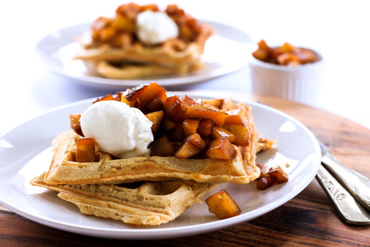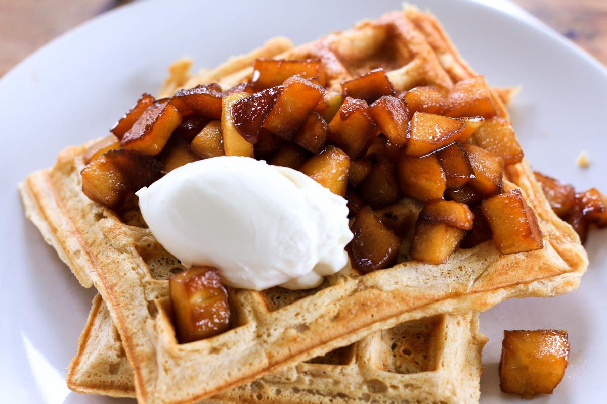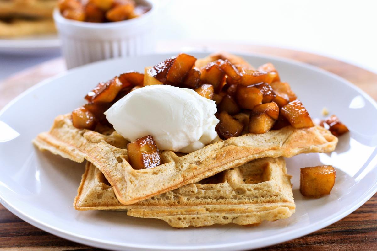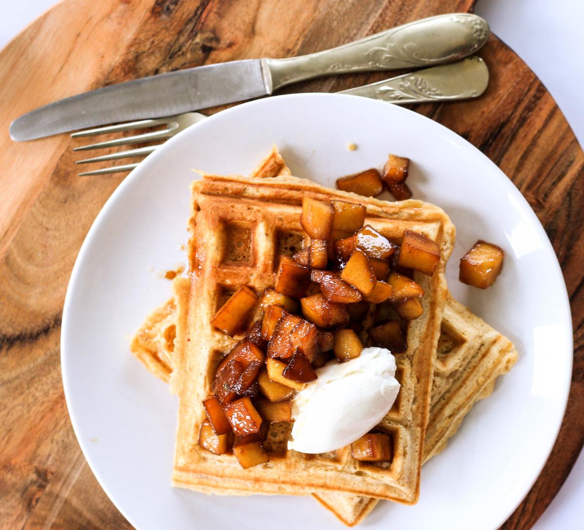 Waffles integrales de limón con manzanas caramelizadas y queso crema. Un balance de sabor ideal para los que amamos los desayunos dulces