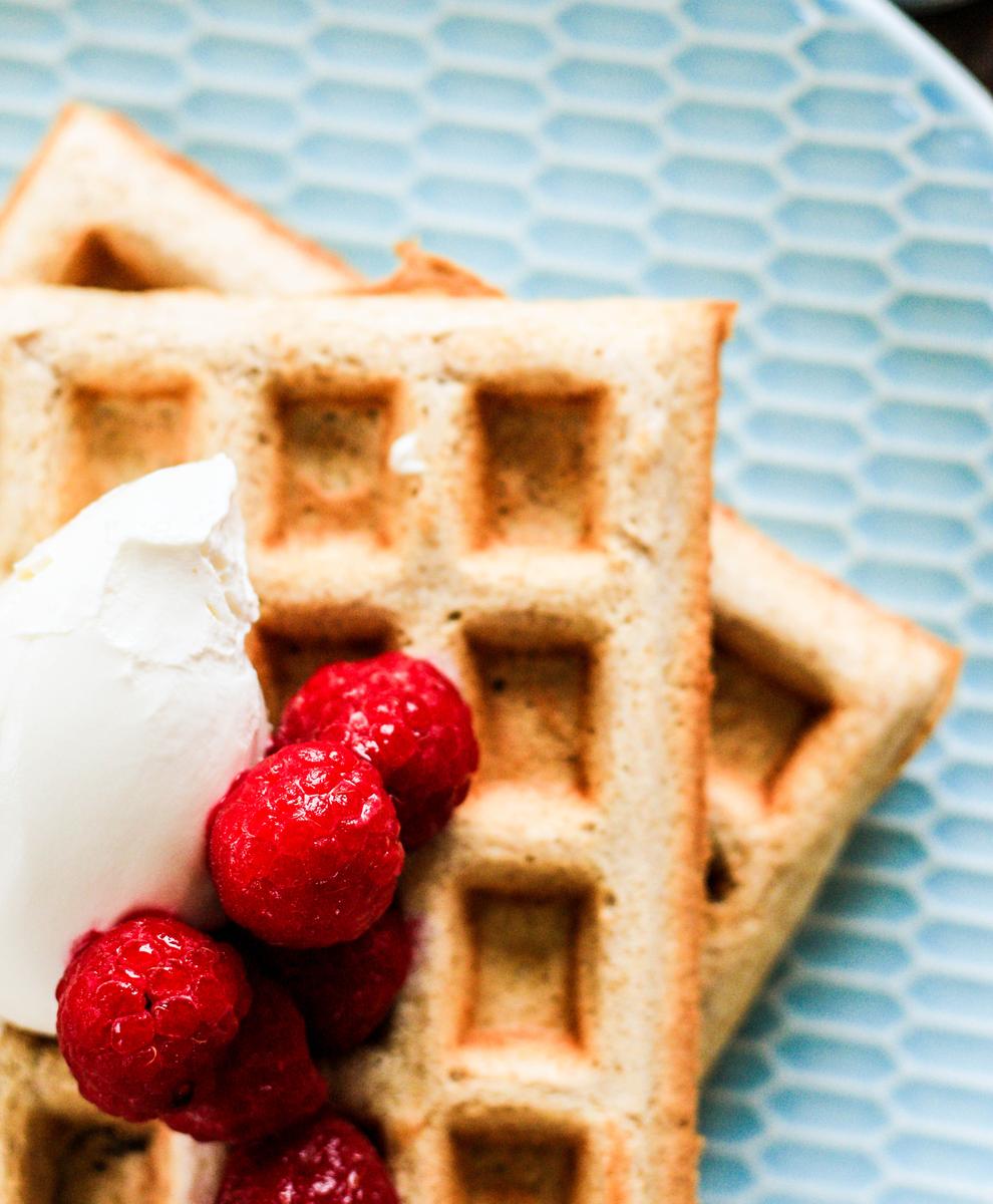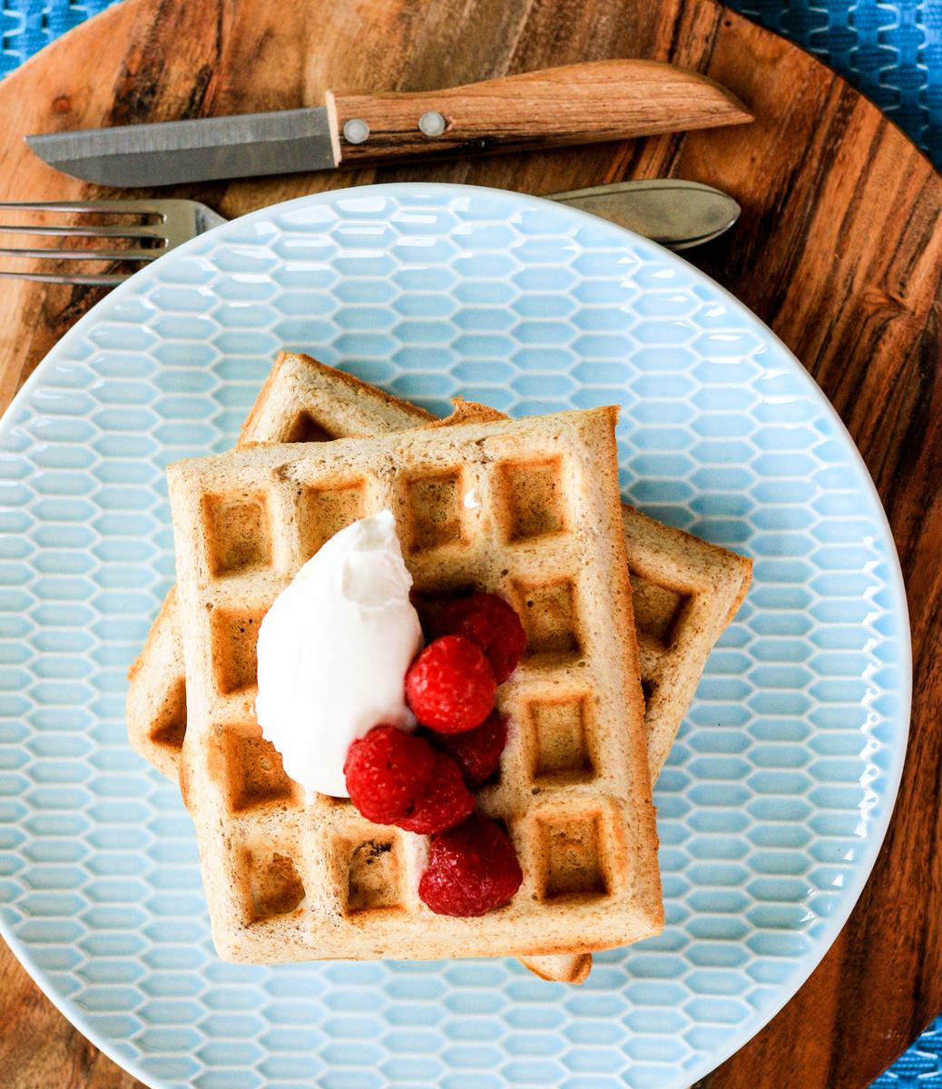 Waffles sin gluten, hechos con trigo sarraceno. Bajos en grasa y mucho más altos en fibra que los wafles sin gluten hechos con premezcla.