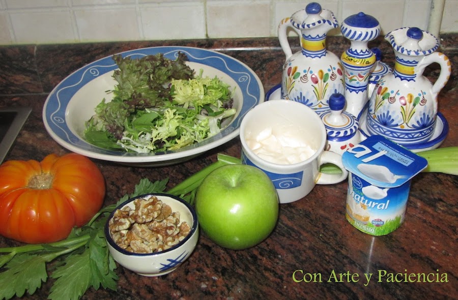 Lavamos y troceamos la lechuga. Laminamos el tomate, apio y manzana.Hacemos una salsa mezclado la mayonesa , yogur y opcionalmente agregamos unas gotas de limón.