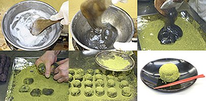 8. Presiona el mochi y córtalo en trozos. Cubre bien los trozos con polvo de soja.