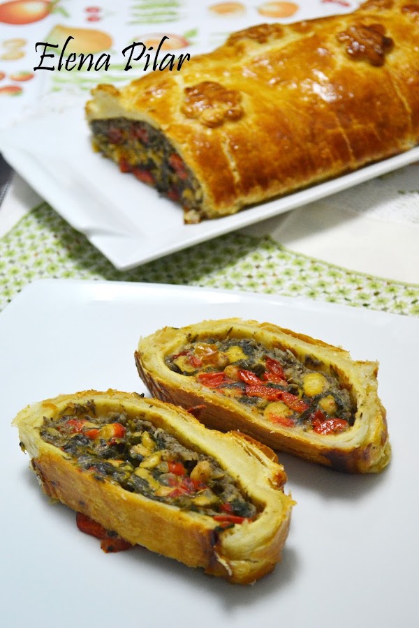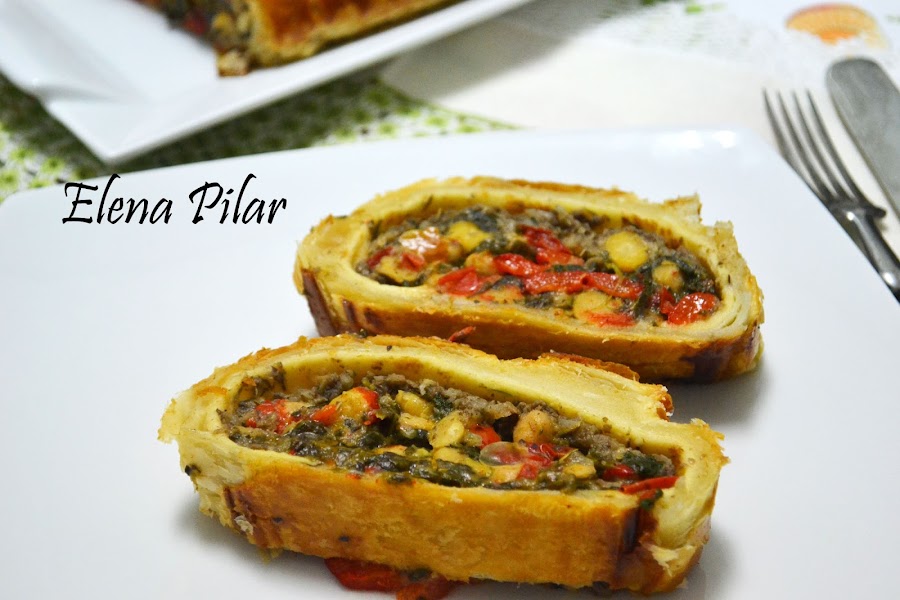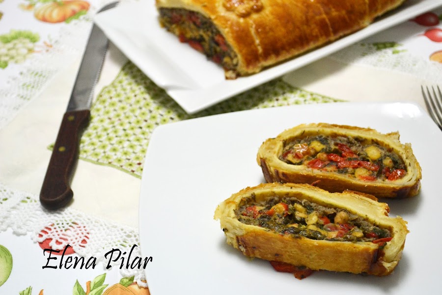 Este rollo estilo Wellington, sin carne, pero con espinacas, garbanzos y champiñones, fue la comida que preparé para el día de Reyes. Y no es que nos gustara, ¡¡¡nos encantó!!! Porque, además de original (Yo nunca antes había visto ni probado un rollo de este tipo), es rico, jugoso, sabroso...