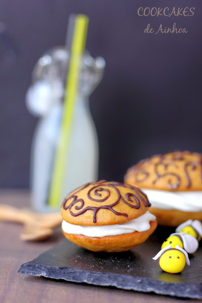 Pues, con estos whoopies he querido hacer un guiño a la cultura Catalana, dónde es típico comer "mel i mató" pero dándole un nuevo formato y además utilizando una miel diferente, la de azahar! Para mi gusto, más suave y delicada, con un sabor muy especial y único! :)