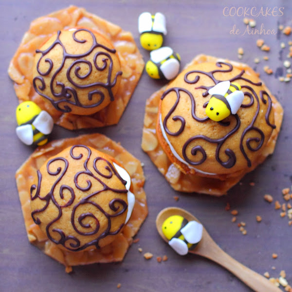 Para servirlos, colocamos una teja de miel y almendra como base de cada whoopie pie y a disfrutar de semejante dulce :)