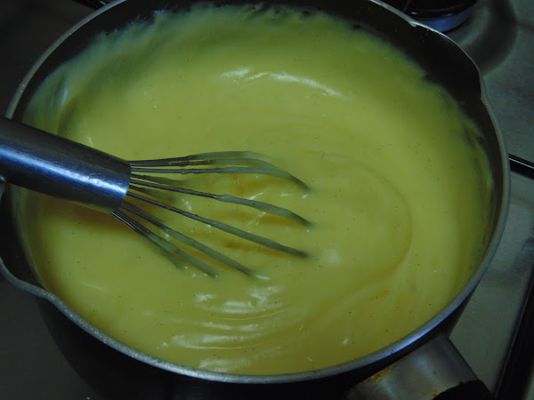 Para la crema pastelera del relleno infusionamos en primer lugar la mitad de la leche con la cáscara de limón y la vaina de vainilla. Calentamos a fuego medio. Apartamos cuando hierva. A la otra mitad le agregamos las yemas de huevo, la maicena y el azúcar. Batimos enérgicamente.