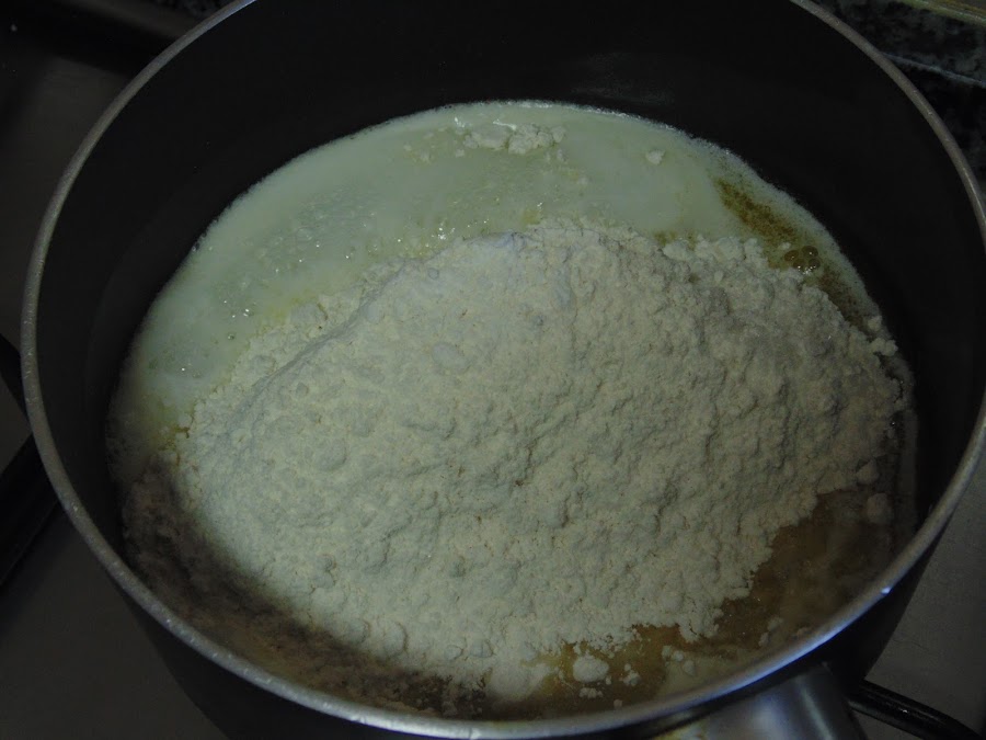 Cuando comience a hervir le agregamos la harina, la sal y la levadura de golpe. Removemos bien hasta que se forme una masa. Dejamos enfriar unos 5 minutos.