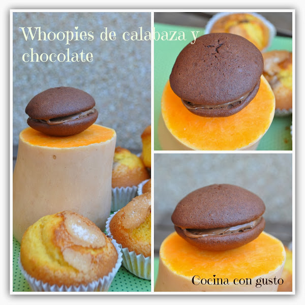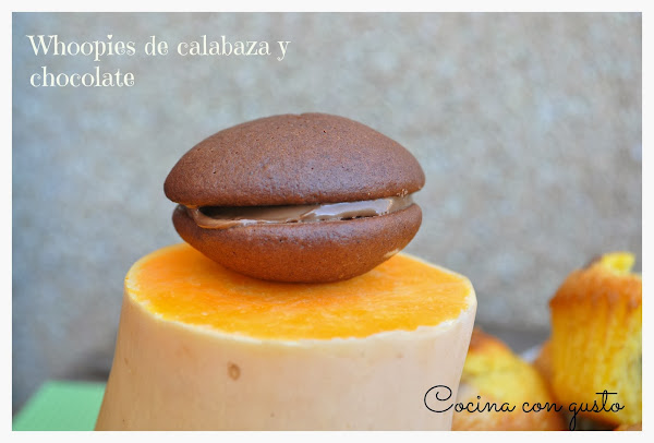 Lo ideal es meter la masa en una manga pastelera e ir haciendo montoncitos sobre una lámina de silicona o papel de hornear. Separar unos de otro porque crecen un poco. Se meten en el horno previamente pecalentado a 180ºC durante unos 12 minutos. Se dejan enfriar un poco y se rellenan con lo que nos guste, en este caso crema de cacao, poniendo otro encima. Son fáciles de hacer partiendo de cualquier receta de bizcocho que esté rica y no sea seca. La que he usado yo yo de Magdalenas de calabaza ha quedado estupenda.Eso si, si vais a coger la receta de un bizcocho que os guste, no la hagáis con todos los ingredientes, que saldrán muchos. Con un tercio dará para unos 10 whoopies (son dobles, asi que serán 20 montoncitos).