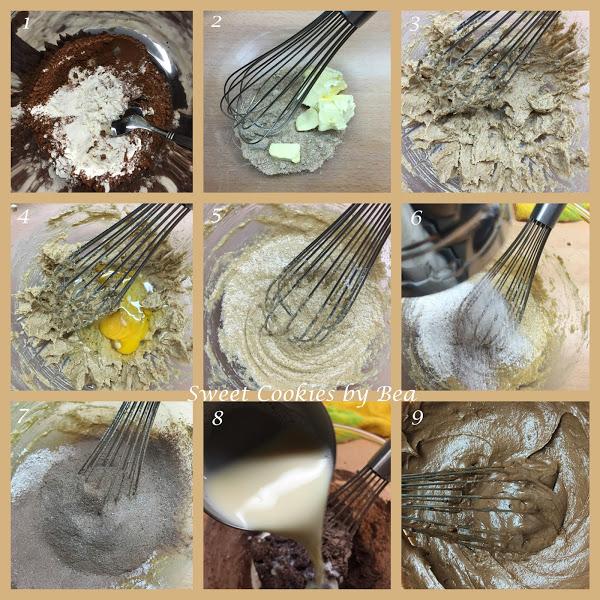 Le añadimos el huevo y el extracto de plátano (4) y batimos hasta que se está integrados (5). Añadimos la mezcla seca de harina cacao y bicarbonato tamizandola (6 y 7). Integramos un poco y le añadimos la leche (8). Despues mezclamos bien todo (9).