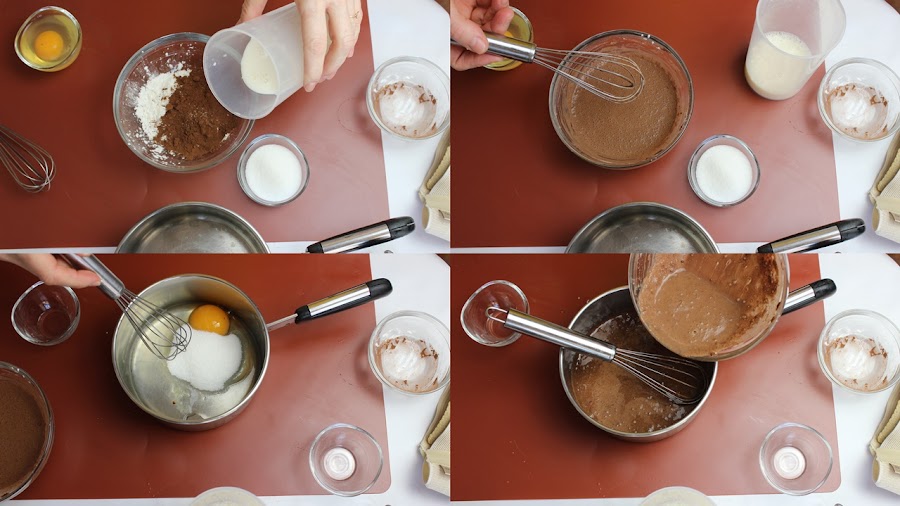 Hacemos la crema de relleno:Mezclamos la maizena y el cacao, añadimos la leche fría y mezclamos bien.