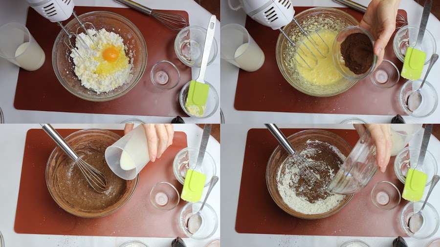 Hacemos la masa:Batimos el azúcar glas con la mantequilla, añadimos el huevo y batimos hasta que esté integrado. Añadimos el cacao en polvo y mezclamos. le ponemos un poco de leche y l harina tamizada junto con la levadura. Añadimos toda la leche y mezclamos bien.