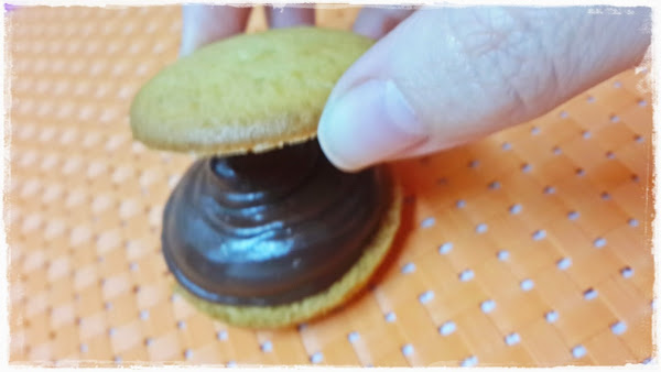 Ponemos la crema de chocolate en una manga pastelera con boquilla grande redonda, colocamos la boquilla en el centro del Whoopie y apretamos hasta que el chocolate llegue al borde.