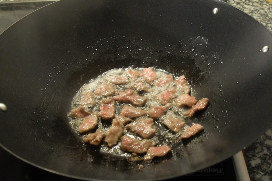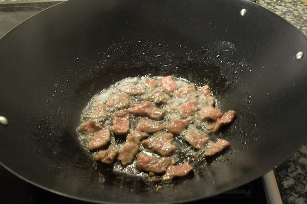 Poner en el wok a calentar al fuego, una vez caliente poner 2 cucharadas de aceite de girasol y añadir el ajo picado y el jengibre rallado, dorar unos segundo y añadir la ternera, saltear unos minutos.