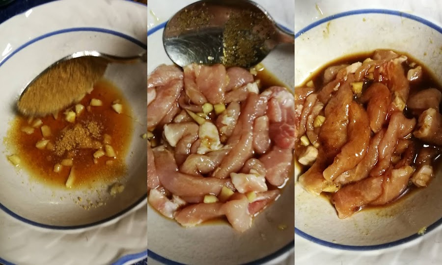 ELABORACIÓN: En un bol ponemos el jengibre troceado y el ajo, añadimos 2 cucharadas de soja, 1 de vino y 1 de azúcar moreno. Ponemos los filetes de lomo a tiras a macerar en esta mezcla durante 1 hora.