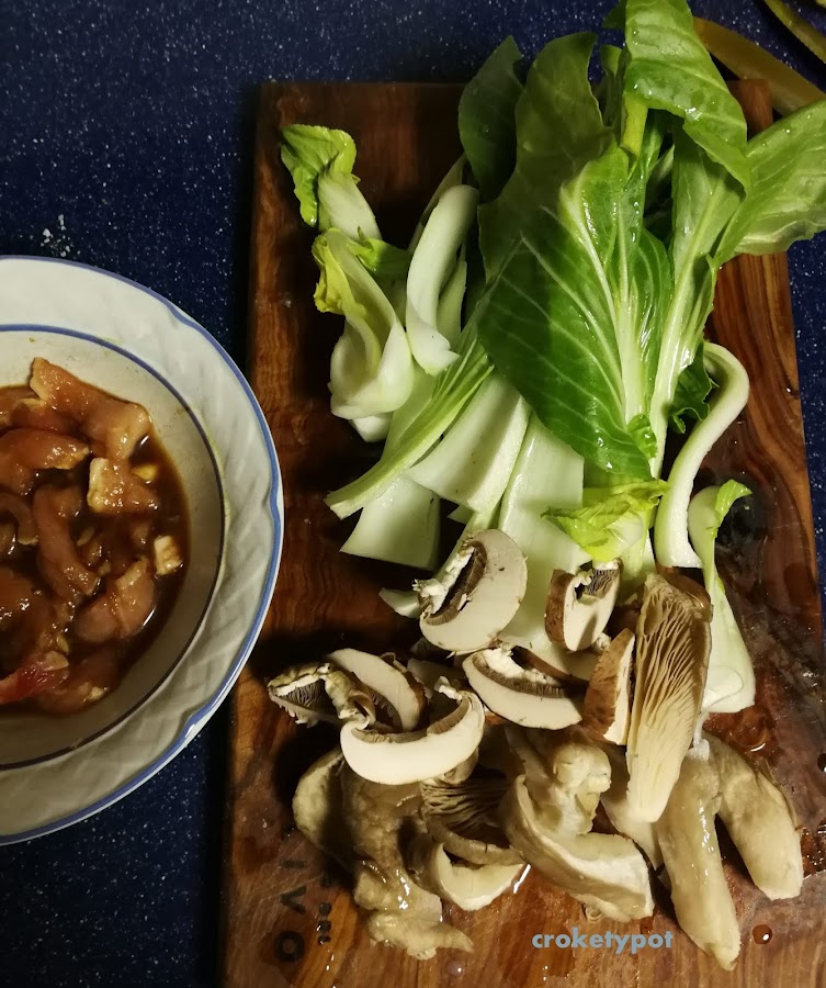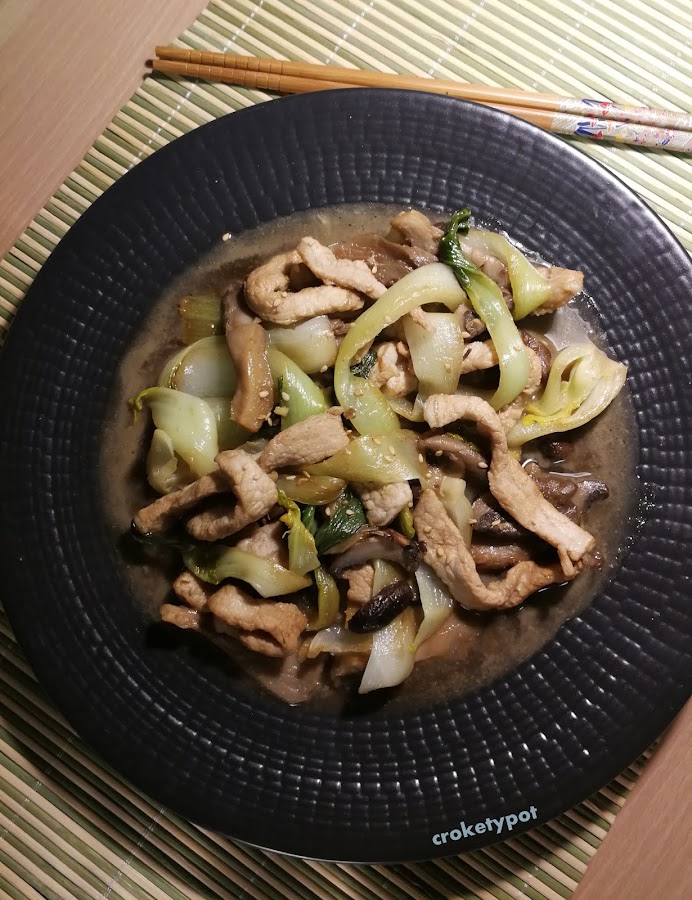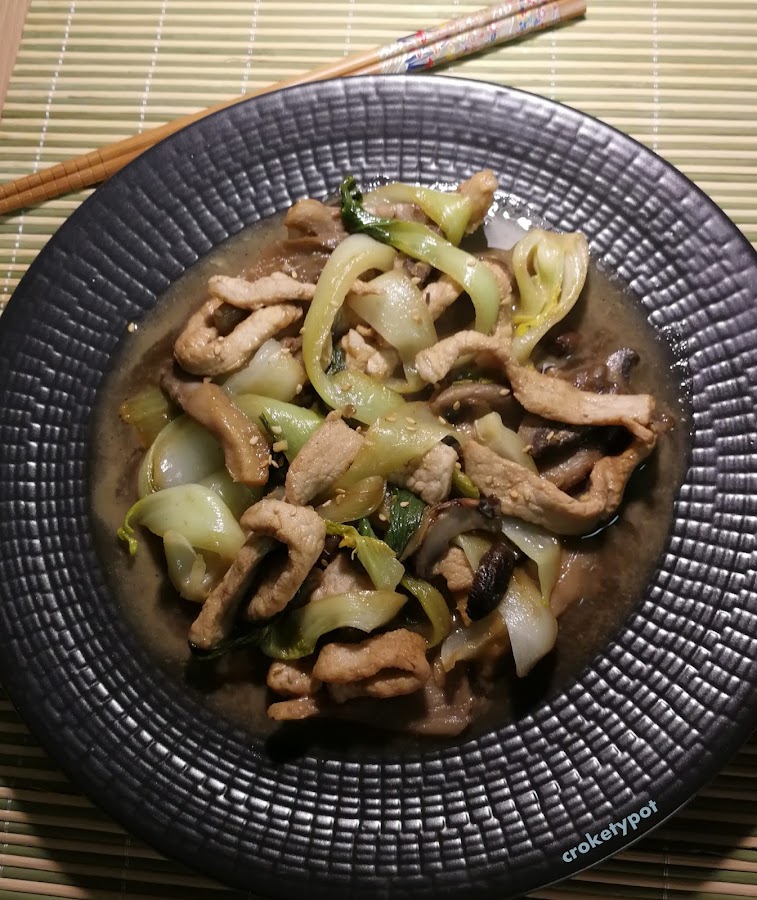 INGREDIENTES: (2 personas) 2 filetes de lomo de cerdo, 1 pak choi, 3 champiñones, 5 setas de chopo, 2 cucharadas de vino blanco tipo Montilla si no tenemos Mirim, 2 cucharadas de salsa de soja, 1 cucharada de azúcar moreno, 1 cucharadita de café de vinagre de arroz, 1 ajo, 1 trozo de jengibre fresco troceado, aceite de sésamo y semillas de sésamo para terminar el plato.
